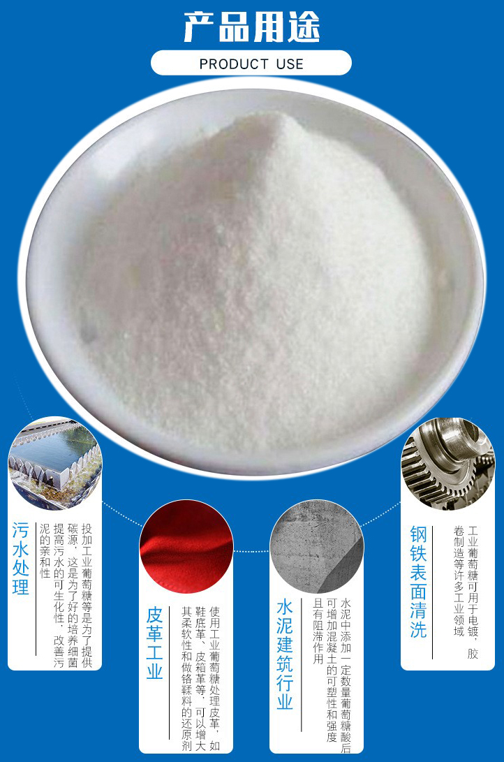 3、工業(yè)葡萄糖用做鋼鐵表面清洗劑:鋼鐵表面如需要鍍缽、鍍鉻、鍍錫、鍍鎳以適應(yīng)特殊用途時,如制造馬口鐵,鍍鋅板,表面鍍鉻(電度)等,其鋼坯表面均需經(jīng)過嚴(yán)格清洗,使鍍層物與鋼鐵表面牢固結(jié)合,這時候其清洗藥劑中添加葡萄糖酸鈉將會達(dá)到十分理想的效果。工業(yè)葡萄糖可用于電鍍,膠卷制造等許多工業(yè)領(lǐng)域。
