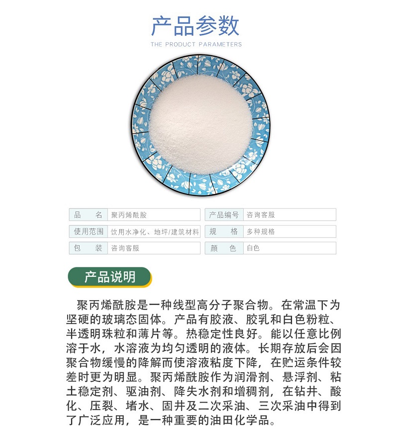造紙助劑:在造紙工業(yè)中可用作紙張干強(qiáng)劑 助留劑 ,能極大的提高紙張質(zhì)量 節(jié)約成本,提高造紙廠的生產(chǎn)能力。可以直接與無機(jī)鹽離子,纖維以及其它有機(jī)高分子發(fā)生靜電橋梁作用以達(dá)到增強(qiáng)紙張的物理強(qiáng)度,減少纖維或填料的流失。加快濾水 起到了增強(qiáng)  助留 助濾的作用,同時在脫模過程中起到了明顯的絮凝效果。
